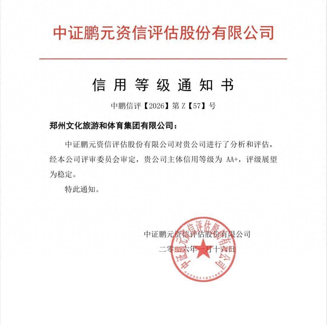 【大河财立方消息】1月16日,经中证鹏元全面评估,郑州文化旅游和体育集团有限公司(以下简称郑州文旅体集团)获评AA+主体信用等级,评级展望为“稳定”。