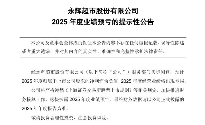1月12日,永辉超市(601933.SH)发布2025年度业绩预亏提示性公告。经公司财务部门初步测算,预计2025年度归属于上市公司股东的净利润为负值,2025年度经营业绩将出现亏损。
