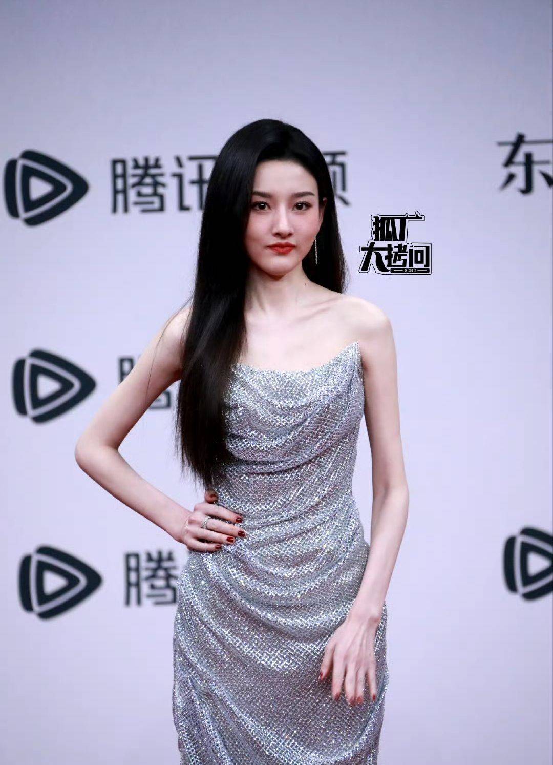 此次亮相红毯,选择了抹胸款的银色长裙,修身的款式既显身材,又因为层层叠叠的设计,增加了几分慵懒的感觉。