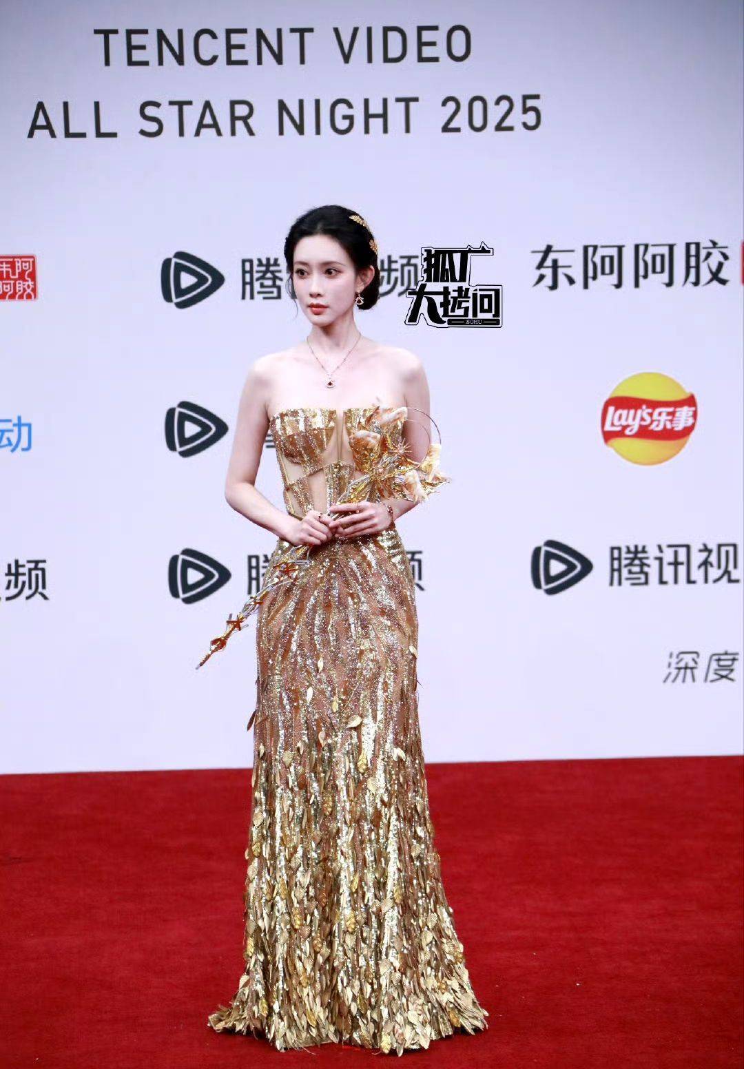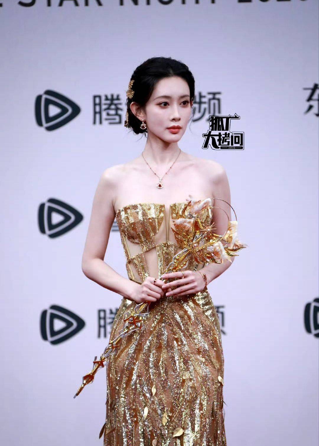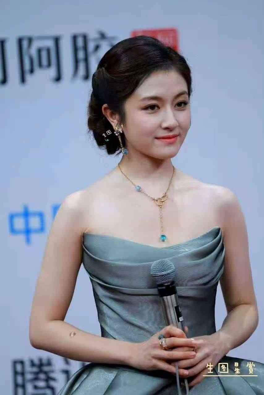 她的盘发造型与白鹿有异曲同工之处,但搭配的裙装,却是深灰色系抹胸裙,大气温婉,不愧是女明星中地母系长相的代表。