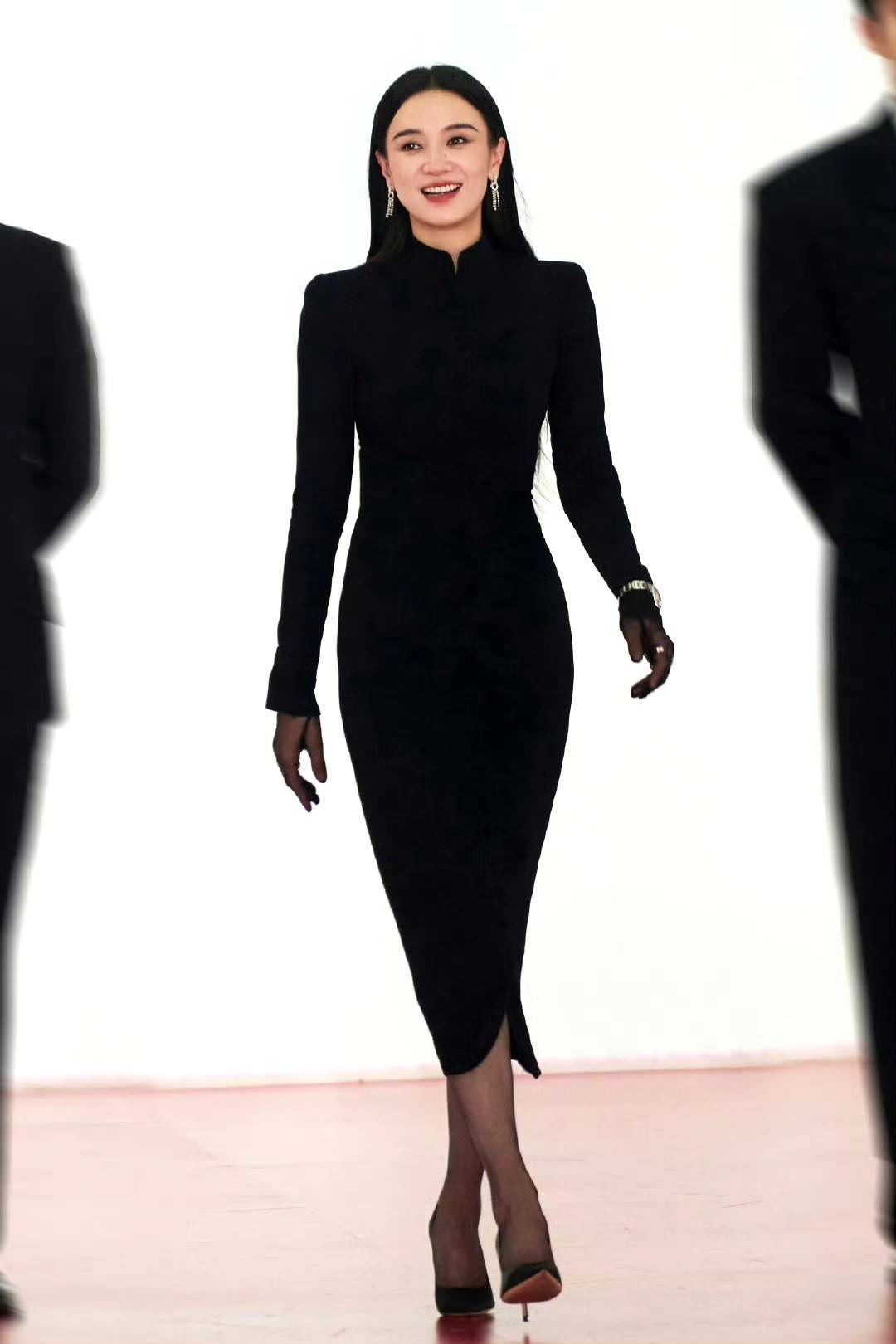此次直接选择了一身黑,立领的修身改良旗袍,配上黑长直的发型,简单又有气场,一亮相就让人觉得又帅又霸气。