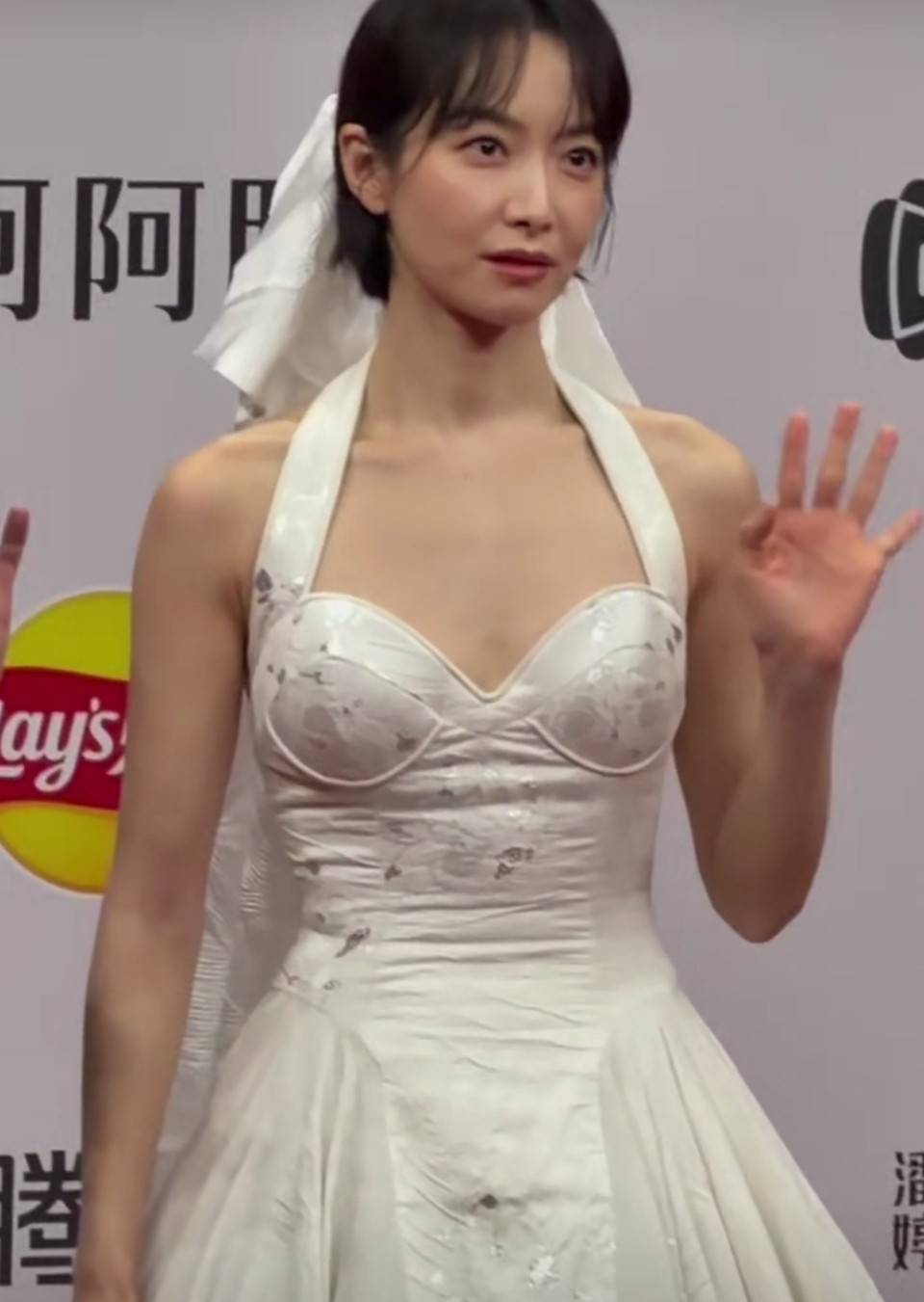 宋茜当天的两套造型有些差强人意,一套是白色系挂脖款婚纱,配上同色系的头饰,像是婚礼上的新娘。