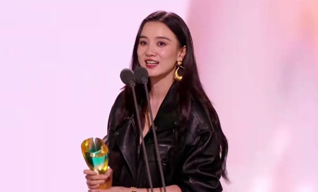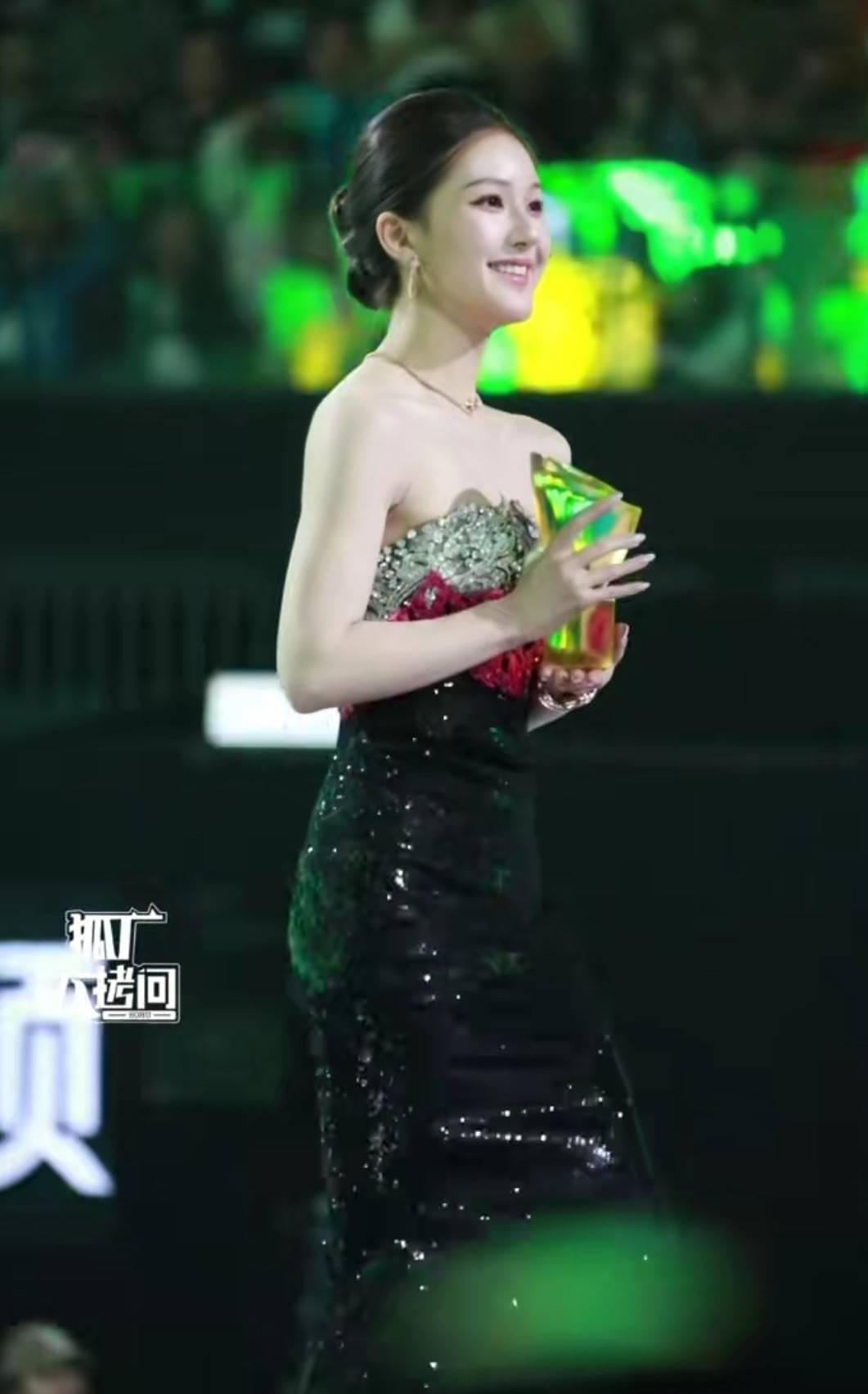 相比之下,上台领奖的黑色抹胸裙装配中分盘发就美多了,优雅又温暖,妆容也看起来舒服了很多。