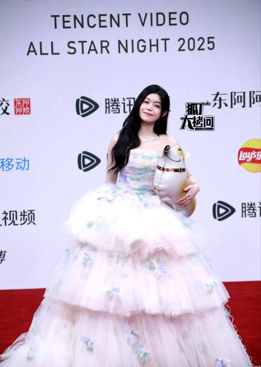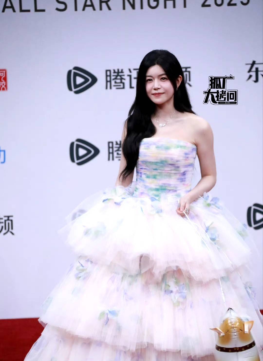 但剧中的陈妍希,走的是知性的都市丽人风,这一次在红毯上,却是穿上了彩色的抹胸蛋糕裙。